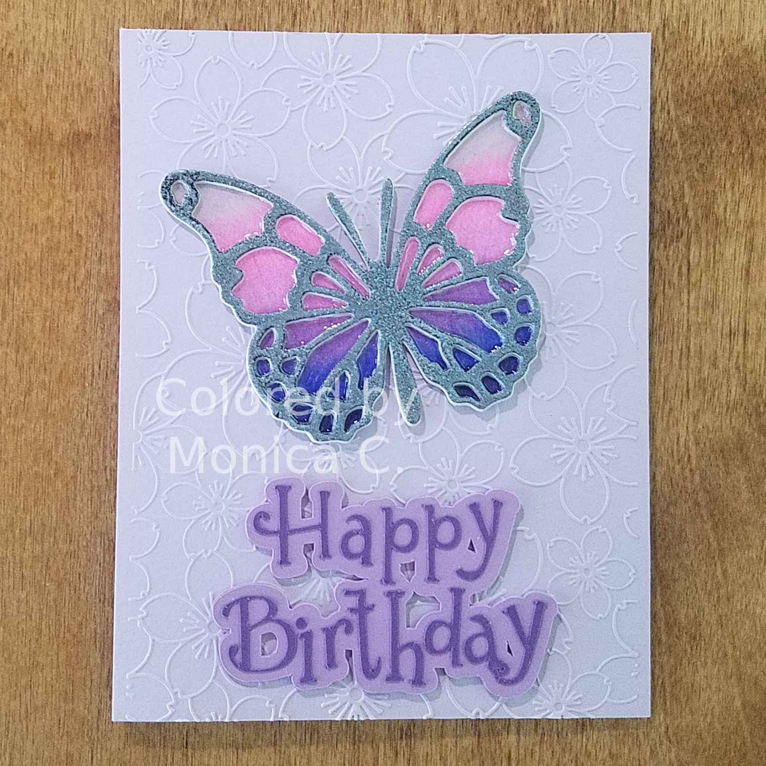 Another inspiration from Jennifer McQuire’s YouTube channel. I loved the beautiful faux stained glass elements that she created and so decided to make one myself. I used this butterfly die from my stash and cut it out 4 times from white cardstock and one time from black cardstock. I traced the outline shape and fussy cut the base. I then used my Prismacolor colored pencils to add the gradient color onto the base.