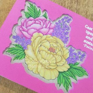 I printed the image onto Strathmore Toned Tan paper and colored it with my Prismacolor colored pencils. I started with the yellow flower, but while doing so a friend came to mind who could use a little uplifting at this time and her favorite color is pink. So the second flower became pink and so did the rest of the card.