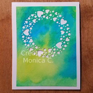 The next card is a panel of the watercolor background with a circle of hearts cut in the center.