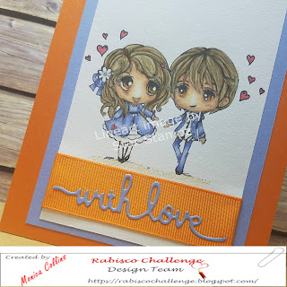I printed the digi out onto Daler-Rowney Drawing paper and colored it in with my Prismacolor colored pencils.I added red glitter gel pen to the hearts. Once completed I trimmed down the focal panel and added a piece of orange grosgrain ribbon along the bottom and then matted that onto a blue piece of cardstock. I completed the card by adding the card panel to an orange cardfront and then glued that all to a white cardbase. I cut the sentiment from the blue carstock and glued it to the ribbon.