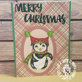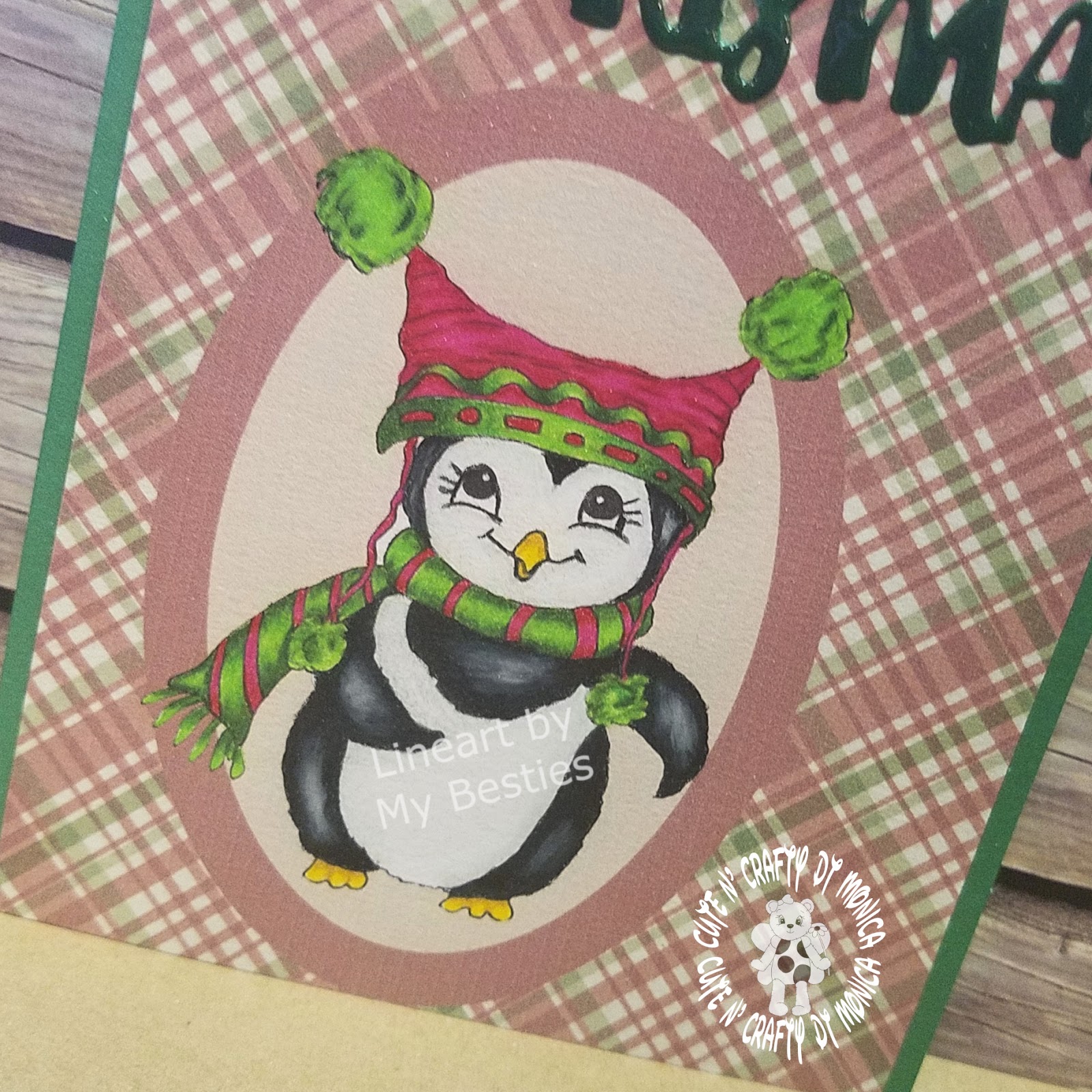 I created the card design in Silhouette Studio. The cardpanel is all one layer. I created a 4×5.5 rectangle and filled it with a digital paper from the Kelly’s Christmas Digital Paper collection by KHDigi. I lowered the opacity of the rectangle to soften the colors of the paper some. I added the digi to the rectangle and sized it accordingly. Then I created an oval behind the penguin and sized it so that the pom-poms and the end of the scarf were outside of it. I created a 0.5 inch offset from the first oval. Using the eyedropper tool, I filled the two with color from the digital paper and then printed the panel out onto Daler-Rowney Drawing paper.