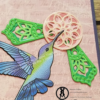 My “flower” is made with a previous Spellbinders Small die of the Month die set. I cut the layers out and glued all of them together except the top layer. Using Versamark ink, I added clear embossing powder to the top die cut. Constantly adding more ink and more powder as the layers cooled, I added a total of 3 layers of powder and the shapes are beautifully shiny and raised. I then glued the top layer to the lower layers and arranged the shapes on my cardpanel. I then added the hummingbird and finally added the cardpanel to a dark purple cardbase.