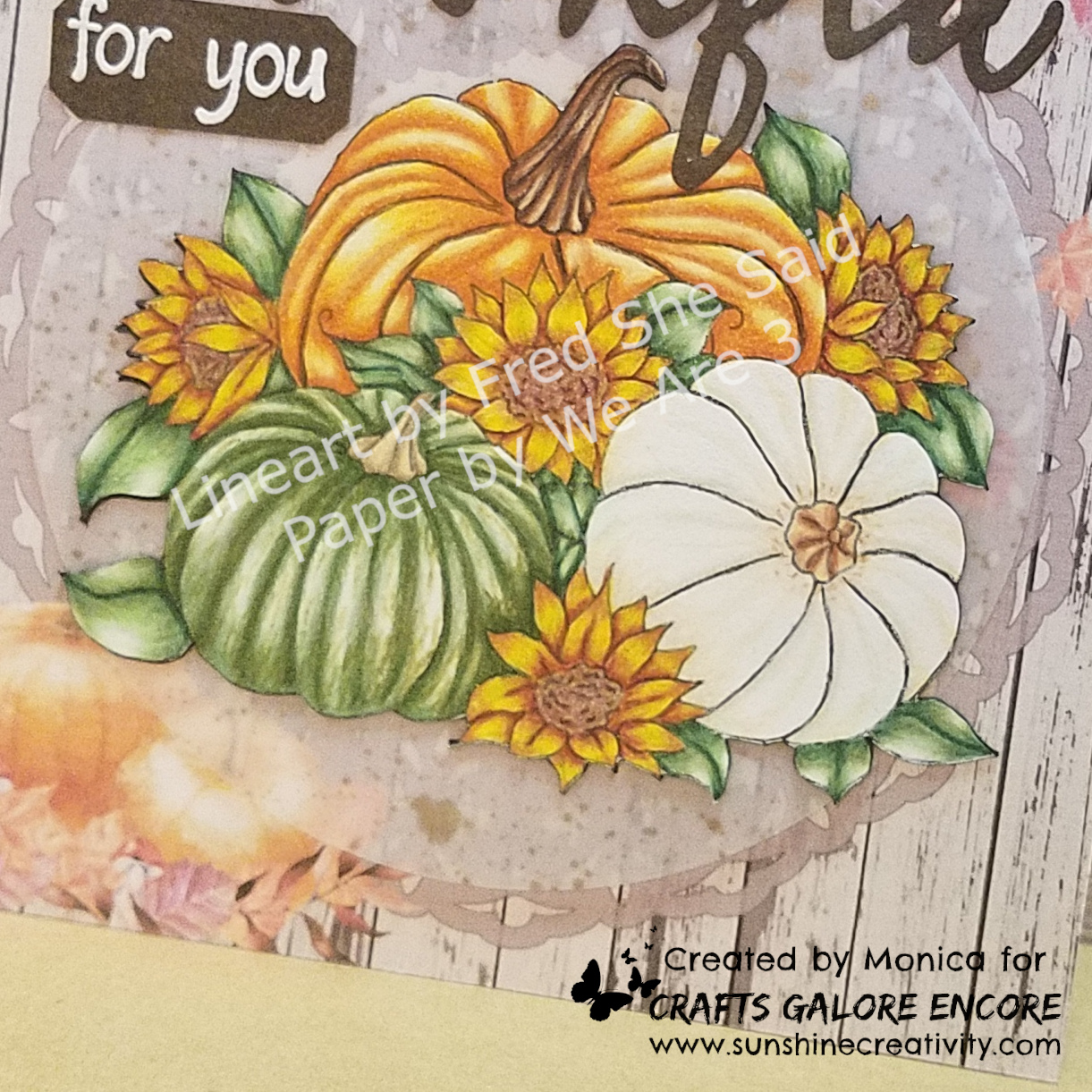 Such a beautiful card, Monica. Love how you coloured the pumpkins and sunflowers. The shabby, wooden paper is perfect for this image. x