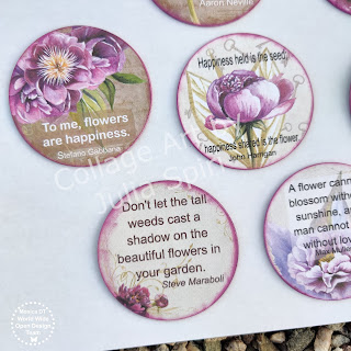 In order to use all the beautiful elements that come in the set, I opted to make another set of ATCoins. I love flowers and it was not hard to find sayings to complement the flowers. Using Silhouette Studio, I created seven 2.5 inch circles on a sheet and filled each one with one of the papers that Julia gave out to her VIP club members some time ago. I lowered the opacity of the front of the coins so that the peonies, feathers and leaves would show up well against the background.