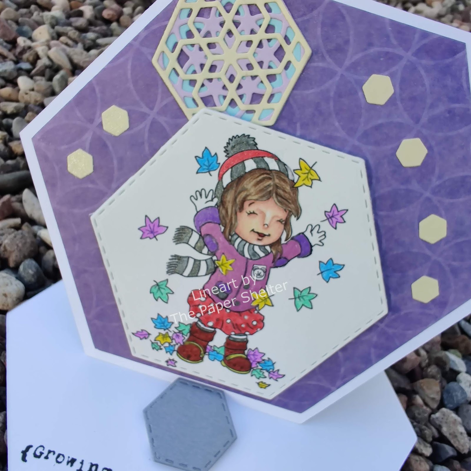 I have used my shape on all levels of the card (card itself, focal image and embellishments) and decided this was the perfect time to attempt my first easel card. I have admired them on other blogs, but had never done one myself. So I designed the base with two merged hexagons that measured 5.5 inches across in Silhouette Studio and cut the shape out with my machine. I cut another hexagon in the same size from white cardstock for my topper. I added a 1/4 inch internal offset to the topper hexagon and cut the smaller one out of the purple patterned paper that was in my stash. I created the hexagon embellishment with Spellbinders dies and assembled it.