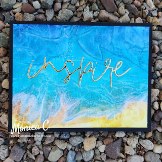 I added the watercolored panel to a black cardbase. I completed the card with a one word sentiment for a Scrapbook.com die set cut out of gold foil cardstock with Stick It adhesive on the back