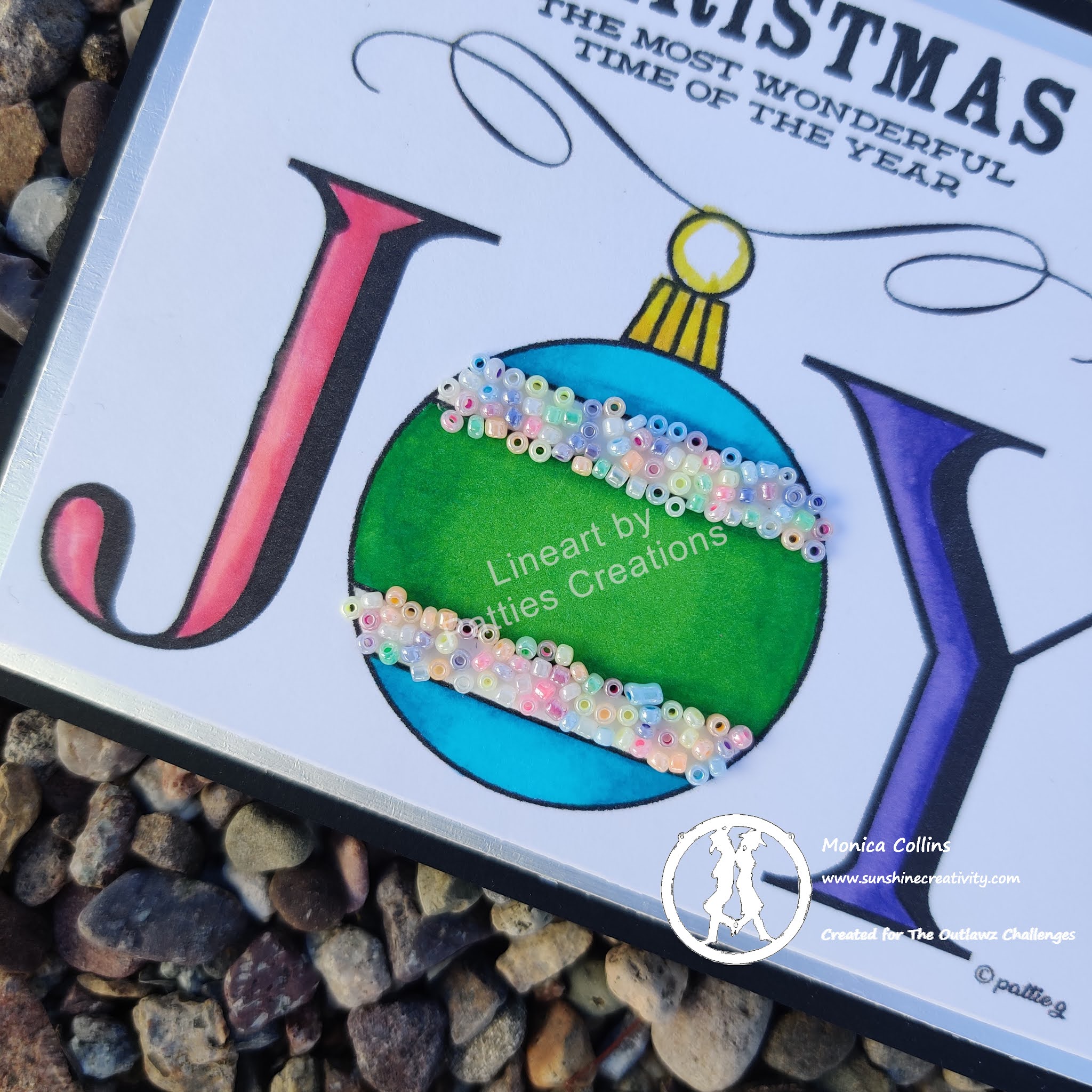 Today is December 15 and so time for another Crash your Stash challenge with the Outlawz. This is my last project as DT of the challenge team. This month our cue is microbeads. I actually think my beads are bigger than microbeads, but I think they worked OK. The sponsor is Pattie’s Creations and I am working with the digi set Joy 1 and Joy 2.