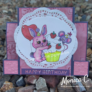 Monica, the mountains and landscape around your new home look a lot like mine. It's 70+ degrees here today and we had a beautiful walk in the fresh air this afternoon. So different from both our coastal landscapes but peaceful and gorgeous, just the same! Your card is absolutely adorable. I love the center step fold and your lacey die cut looks so pretty framing your beautifully colored bunny image. So many fun details. xo